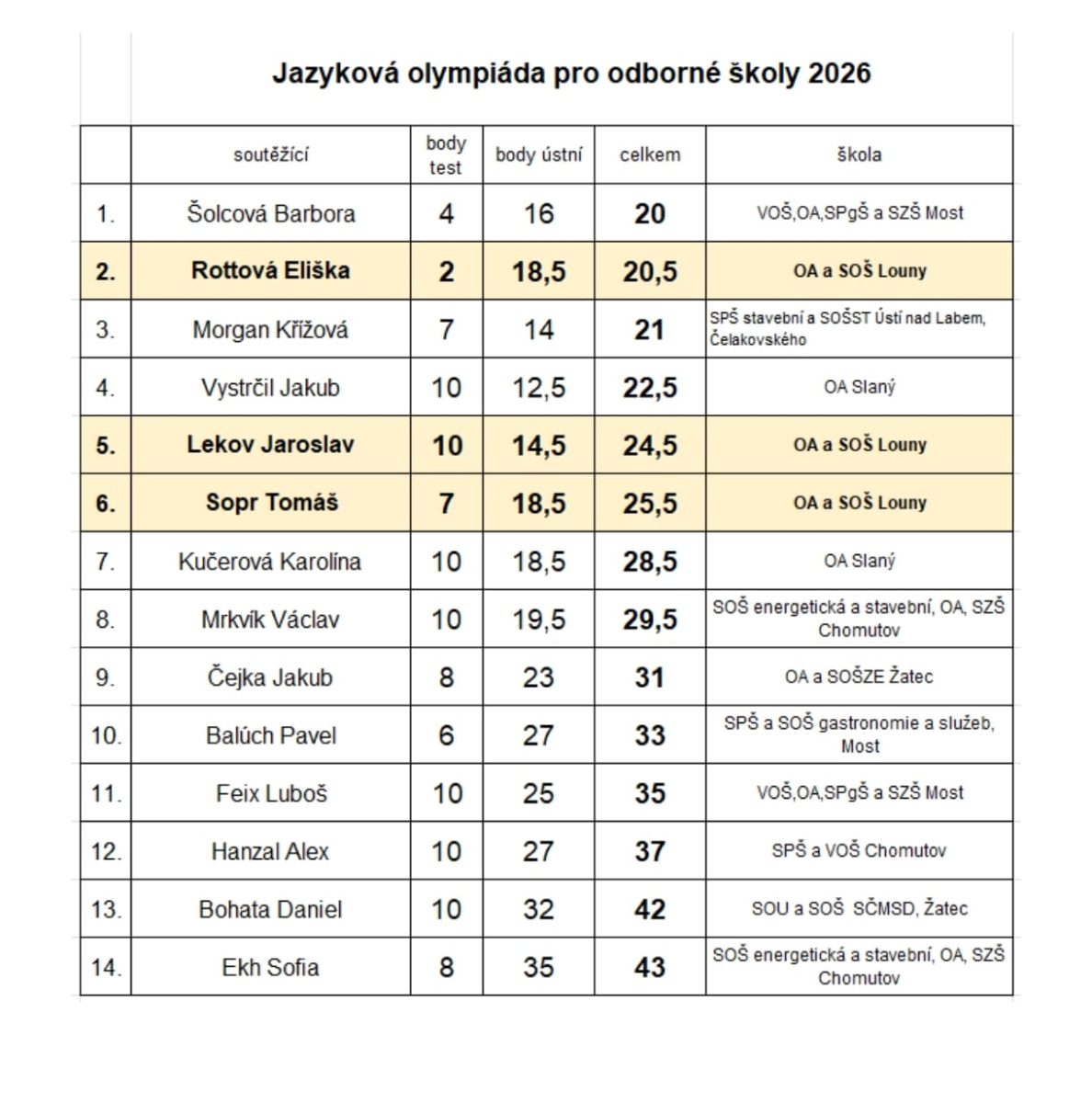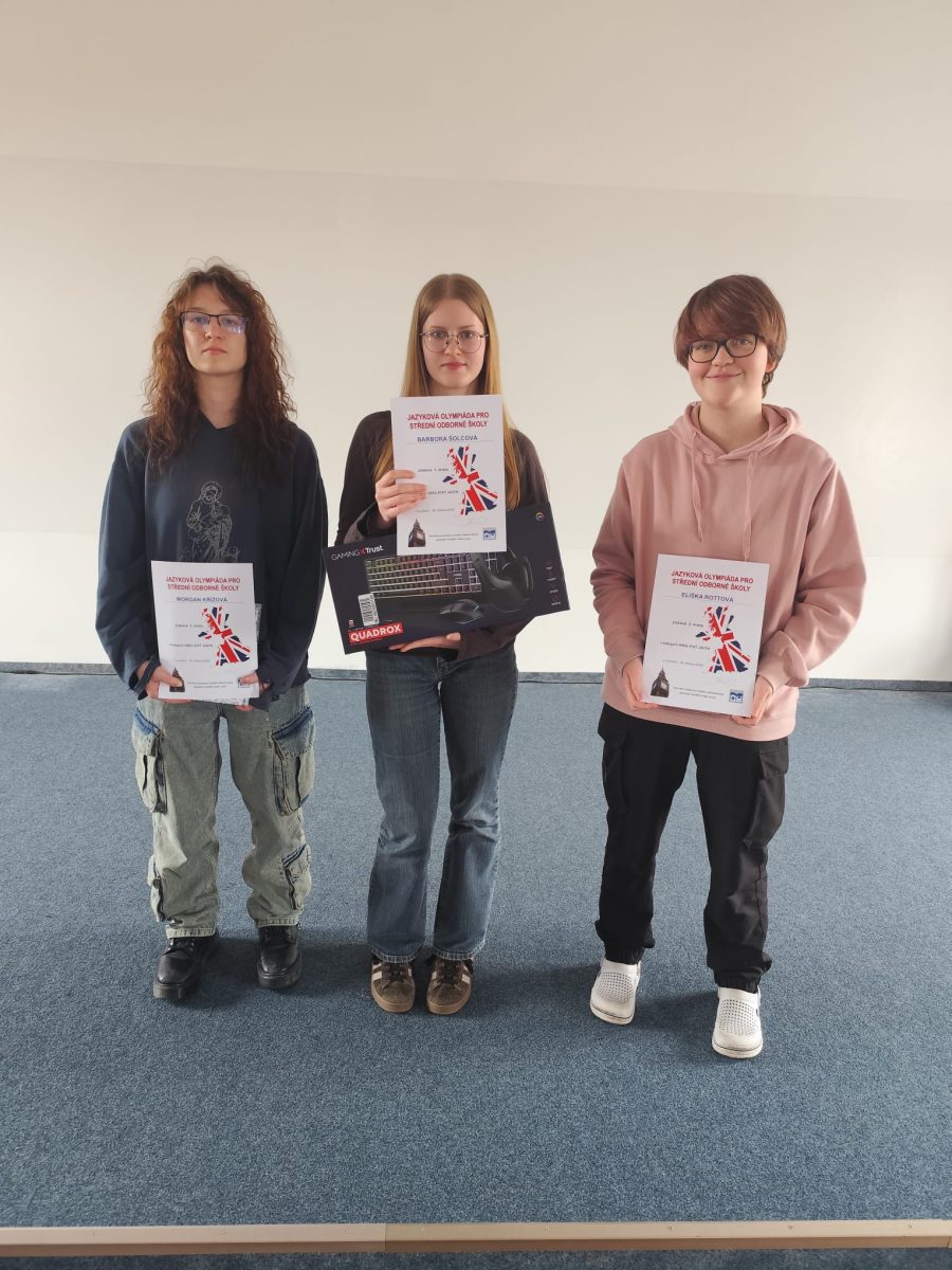 Ve středu 25. března 2026 se na naší škole uskutečnil již 18. ročník jazykové olympiády pro střední odborné školy. Zúčastnilo se 40 studentů ze 14 škol z Ústeckého a Středočeského kraje. Naši školu reprezentovali Eliška Rottová (EKL3), Tomáš Sopr (STR2), Jaroslav Lekov (OAK2), Kryštof Kolář (STR3). Po úvodním testu se mezi 14 nejlepších postupujících do ústního kola propracovali hned naši tři studenti, kteří se neztratili ani ve velmi vyrovnané konverzační části. Po sečtení výsledků z obou částí se Eliška Rottová umístila na skvělém druhém místě, Jaroslav Lekov na pátém a Tomáš Sopr na šestém místě.